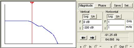 從圖可以看出電路的截止頻率約為64.6KHz,高于64.6KHz的信號將大幅衰減。